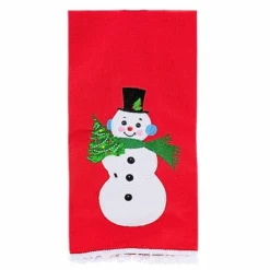 - This adorable towel features a charming snowman wearing a black top hat, blue earmuffs, and a green scarf, and holding a decorated green Christmas tree. Perfect for adding a touch of holiday cheer to your kitchen.